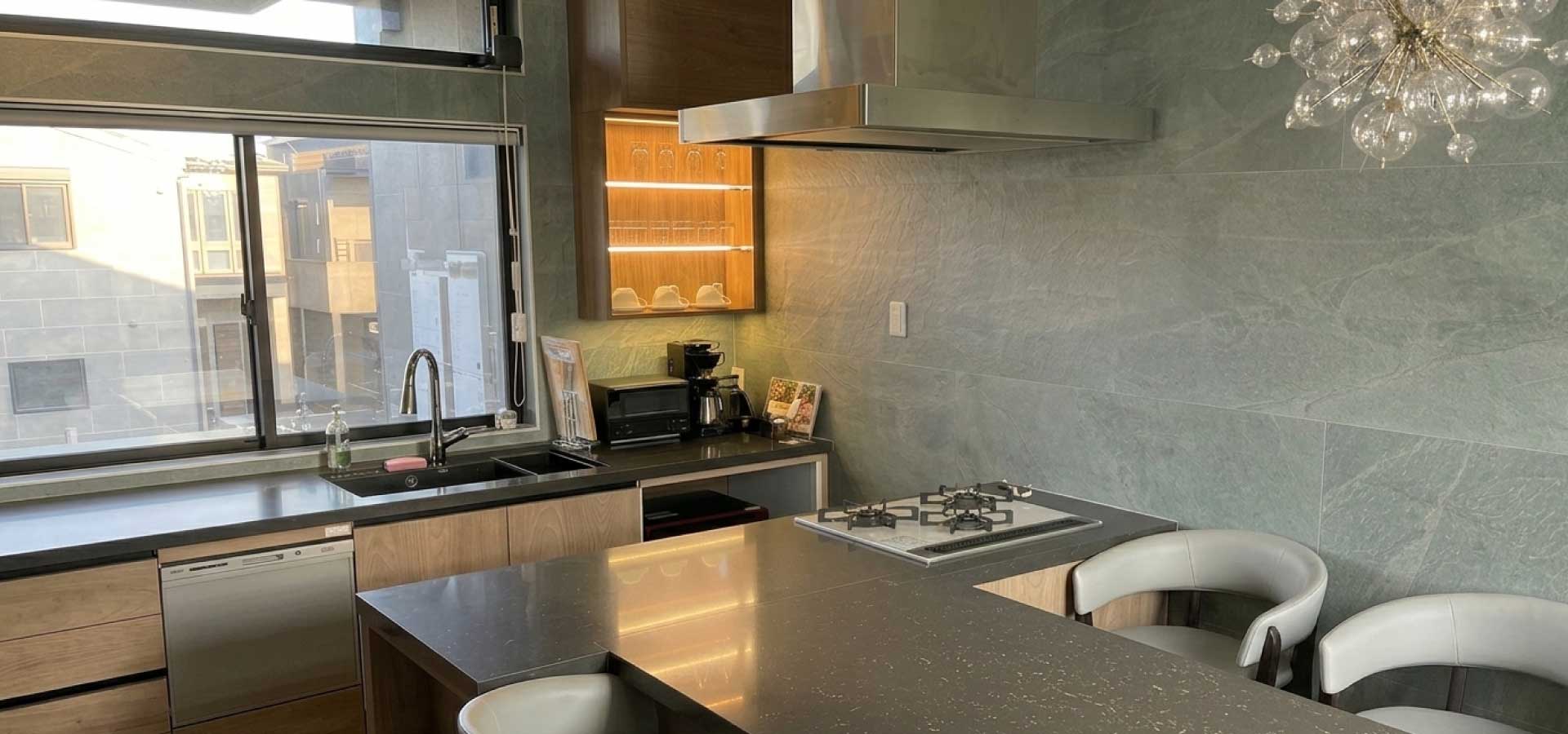 キッチン備え付けの為、目の前でシェフの調理を見ることもできます。普段と違った贅沢なお食事をお楽しみください!
