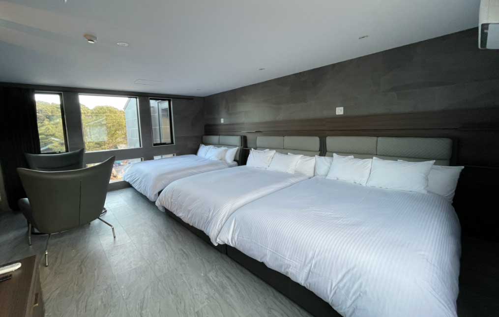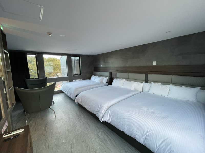 広々とした空間の寝室から大きな窓を通して外の景色を眺めることができ、開放感があり、自然の中でゆったりとしたひとときをお過ごし頂けます。